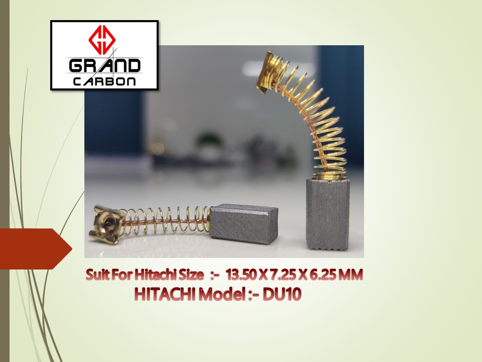 High Quality, Long Lasting, Spark Free & Original Grade Power Tools Carbon Brush is Suitable For Hitachi DU-10, This Carbon Brush Size is : 13.50 x 7.25 x 6.25 M.M., and This Carbon Brush is Used For 10mm Compact Drill.